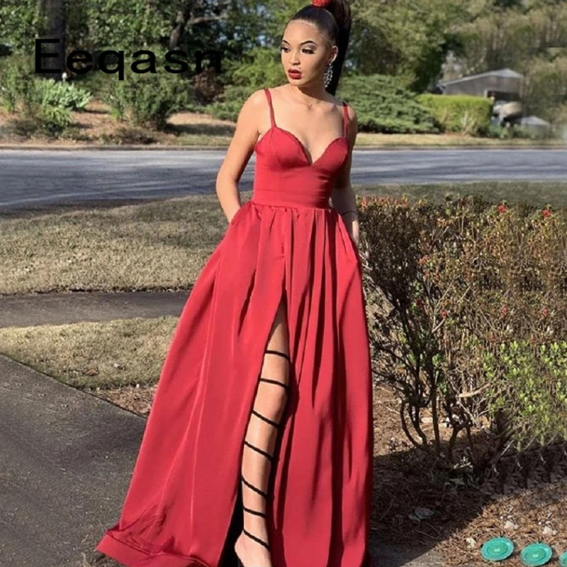New Elegant Long Prom Dress With Pockets Slit A Line Sweep Train