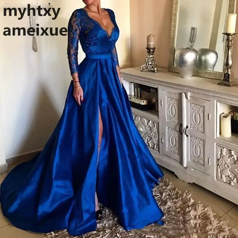 2019 Royal Blue Plus Size Prom Dresses V Neck Lace Appliques Long
