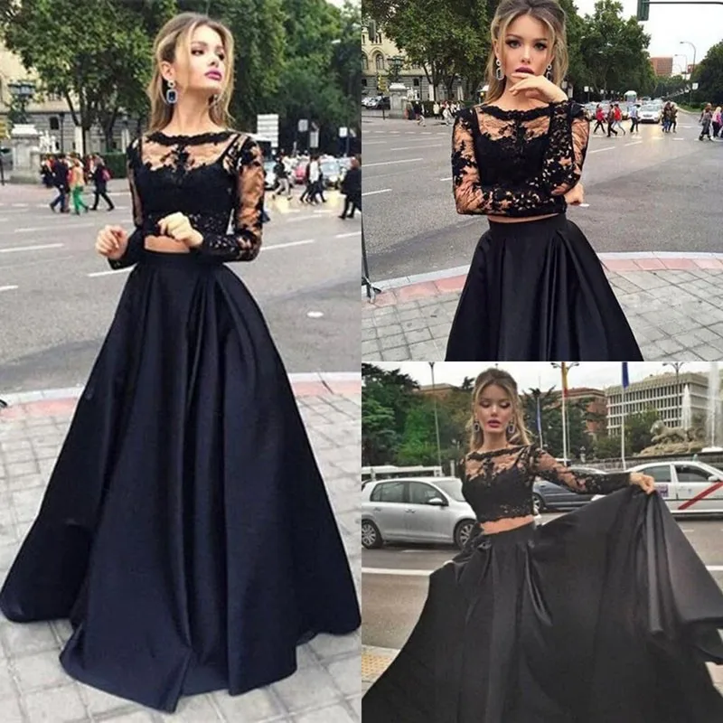 Classic Black Two Pieces Prom Dresses Long Sleeve Lace Bateau