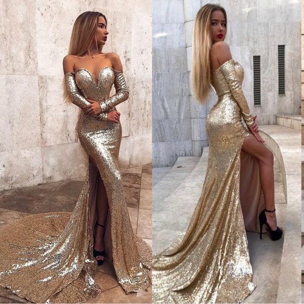 Plus Size Gold Sequin Prom Dresses 2019 Mermaid Off Shoulder Long