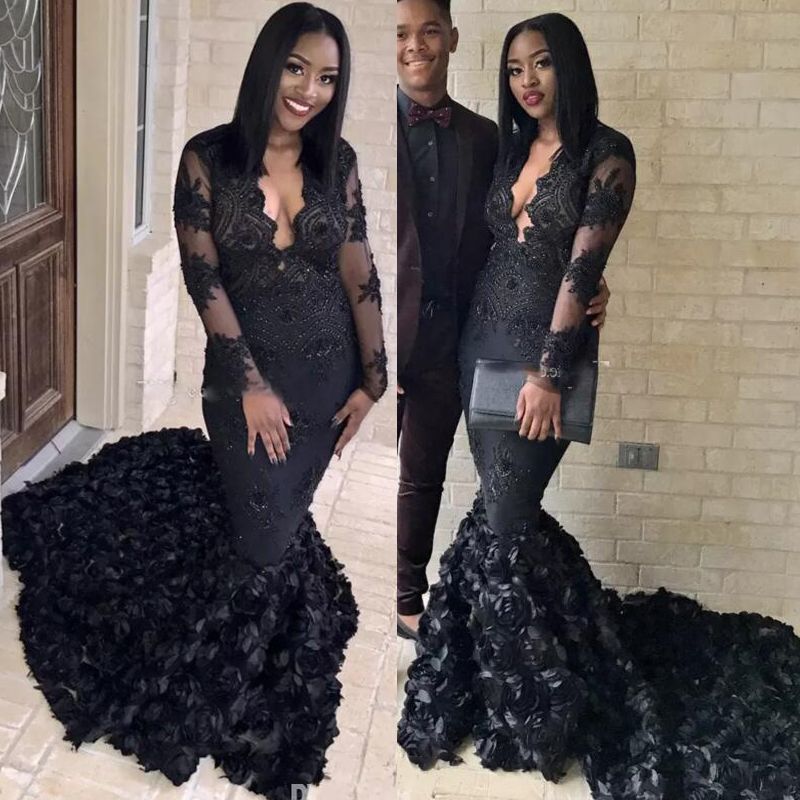 3d Rose Floral Black Girls Plus Size Prom Dresses 2019 Long Sleeve