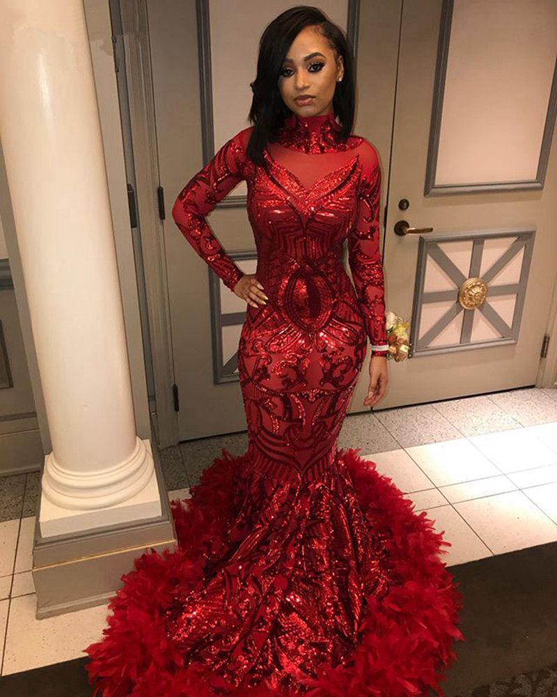 Sparkly Sequin Red Mermaid Evening Dresses 2019 With Feathers Long