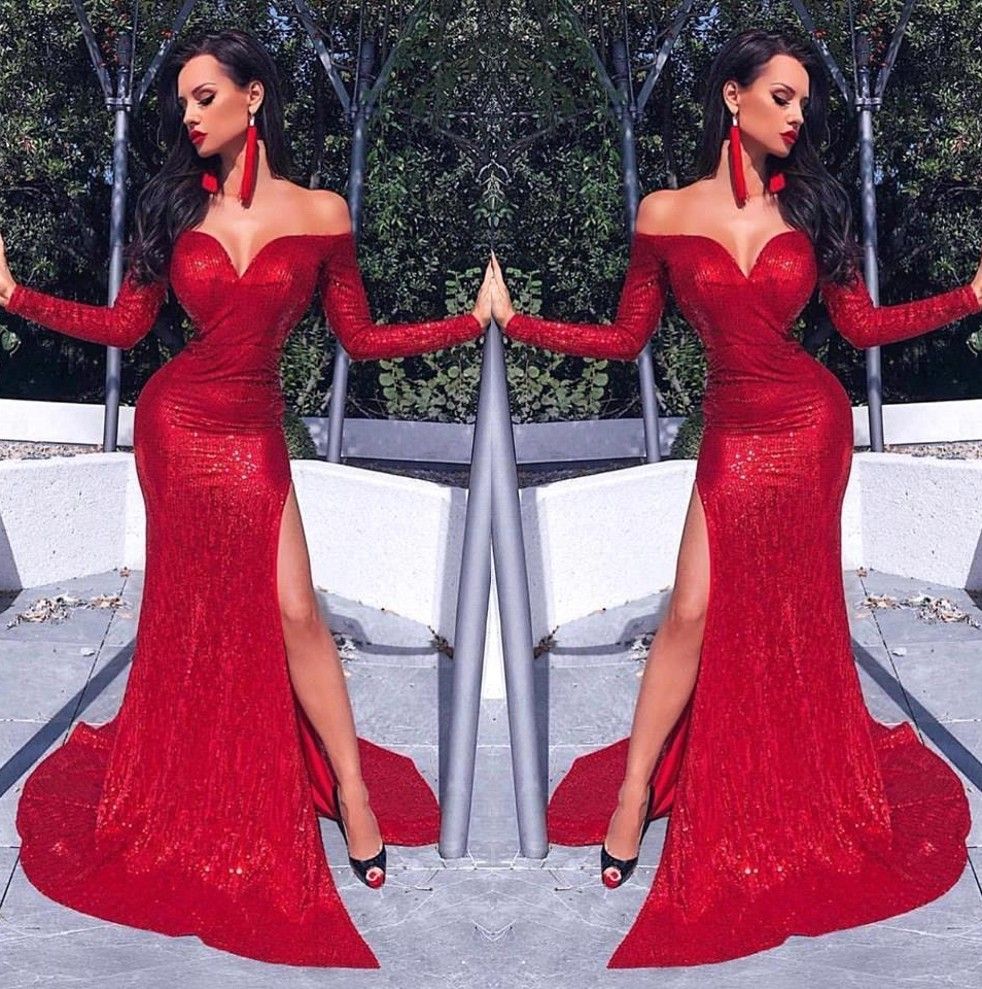 2019 Red Off The Shoulder Sequined Mermaid Long Prom Dresses Long