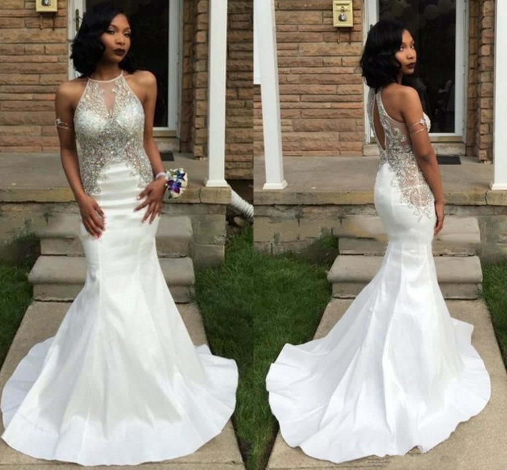 Sparkly Beaded Rhinestone Prom Dresses White Mermaid Evening Gowns