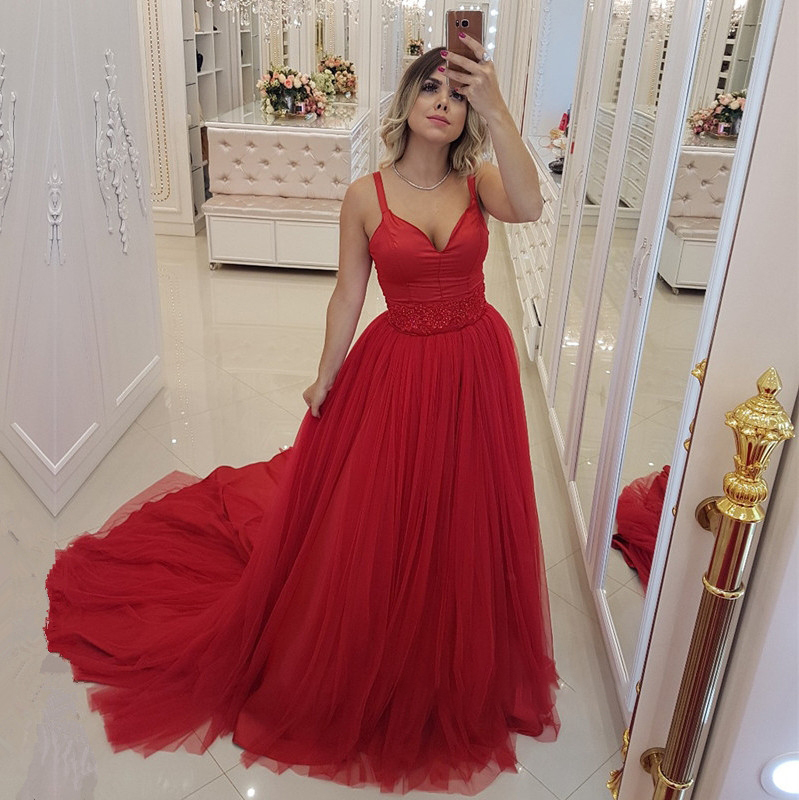 Red Prom Dresses 2019 Beaded Puffy Tulle Sweetheart Neckline Long