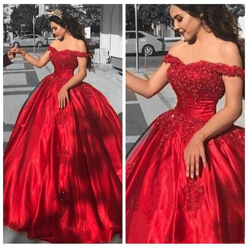 New Elegant Red Off Shoulder Ball Gown Prom Dresses Long Appliques