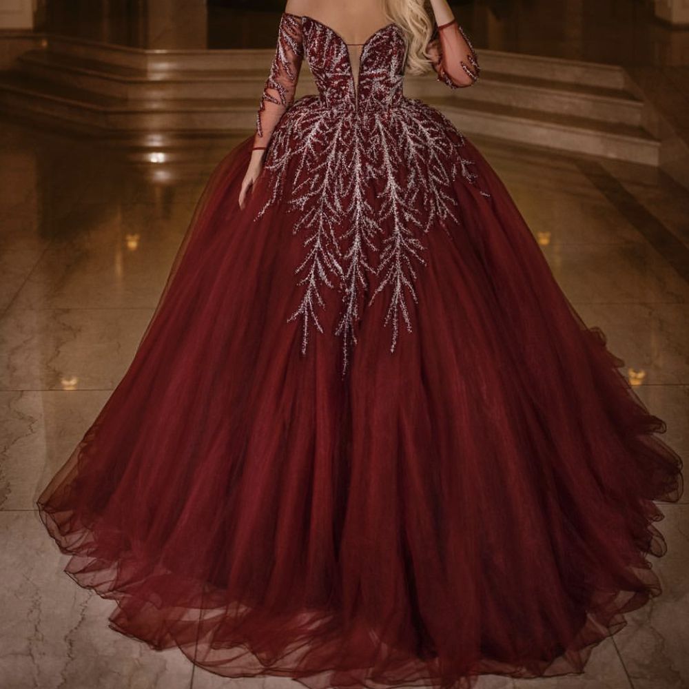 Elegant Dark Red Long Sleeve Puffy Lace Prom Dresses Tulle Ball