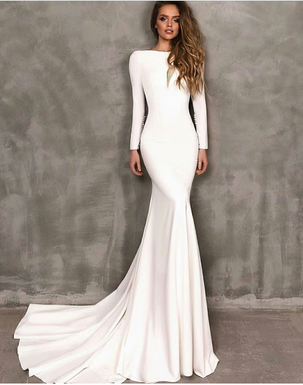 White Round Neck Long Sleeves Open Back Mermaid Wedding Dresses