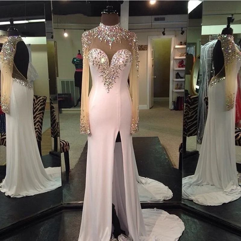 Buy Sheath High Neck Long Sleeves Split Open Back White Prom Dress