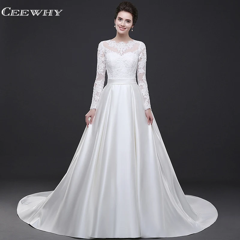 White Round Neck Long Sleeves Open Back Satin Wedding Dresses Niceoo