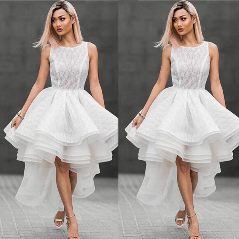 White High Low Dress 2018 Elegant O Neck Short Front Long Back