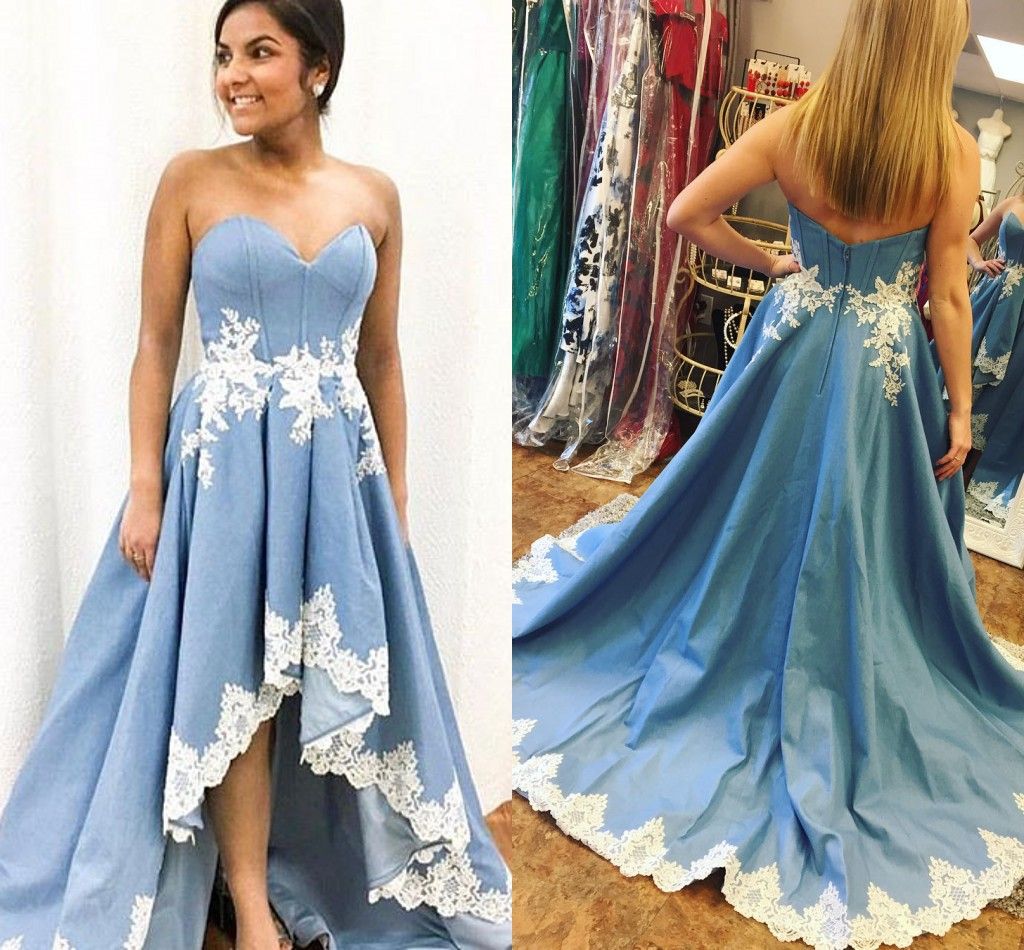 2019 High Low Royal Blue And White Prom Dresses Sweetheart