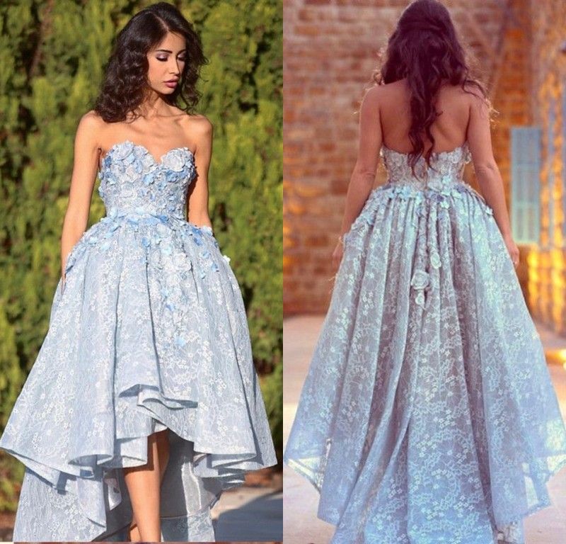 Half Sleeve White And Blue High Low Prom Dresses Lace Elegant