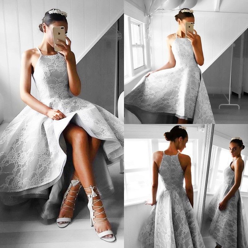 New Silver Lace Prom Dresses Short Front Long Back A Line