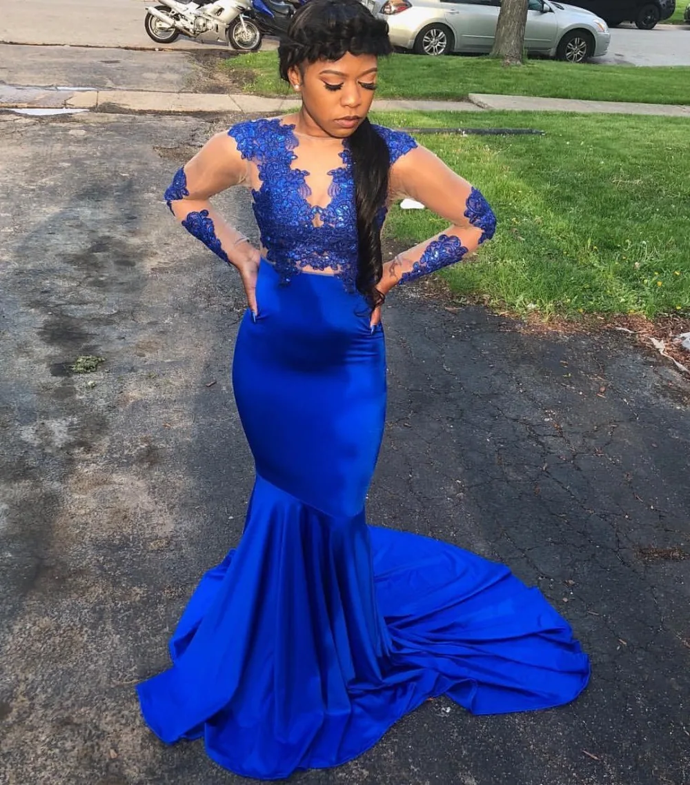 Mermaid Royal Blue Prom Dresses Applique Prom Dresses Long Sleeve