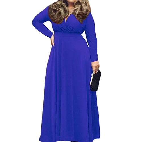Dark Blue Plunging Long Sleeve Casual Maxi Plus Size Dress 069354