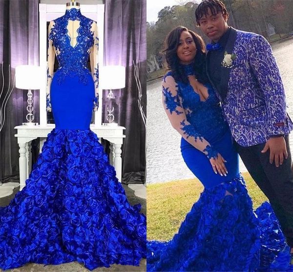 Royal Blue 3d Floral Mermaid Prom Dresses Black Girls High Neck