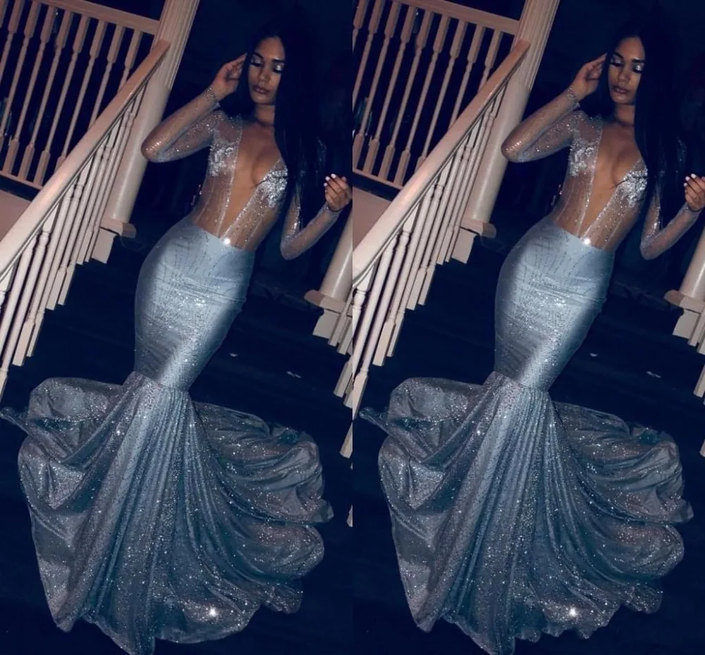 Plus Size Long Sleeve Mermaid Prom Dresses 2019 New Sequined Deep