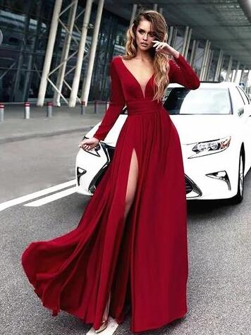 Sexy Deep V Neck Long Sleeve A Line Slit Prom Dress