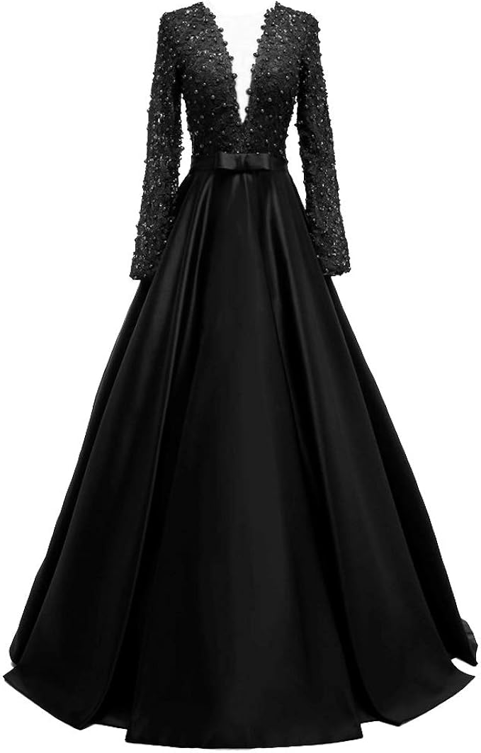 Deep V Neck Long Sleeve Black Lace Long A Line Black Satin Prom