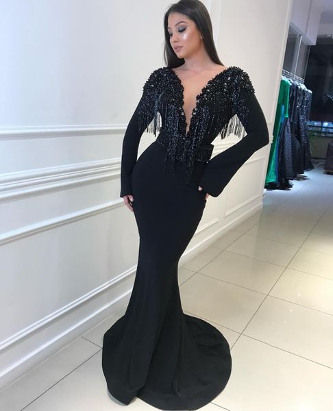 2020 Sexy Black Mermaid Deep V Neck Long Sleeves Tulle And