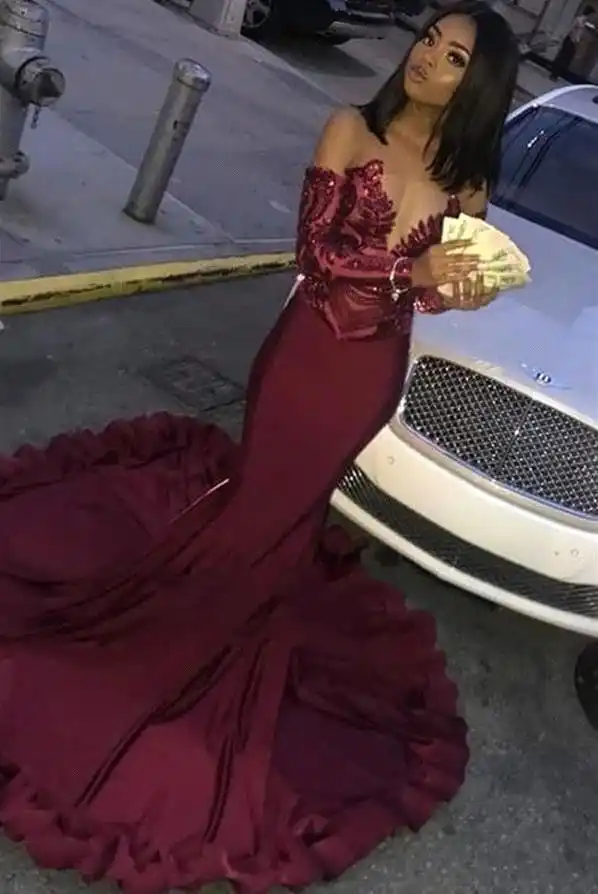 139 99 Burgundy Long Prom Dresses 2019 Mermaid Long Sleeves