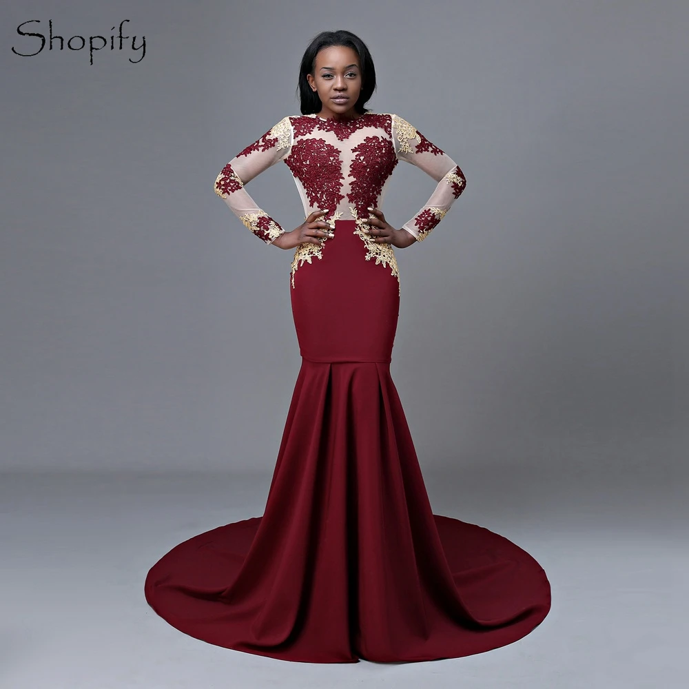 African Sexy Burgundy Long Sleeve Mermaid Prom Dress 2020 Gold