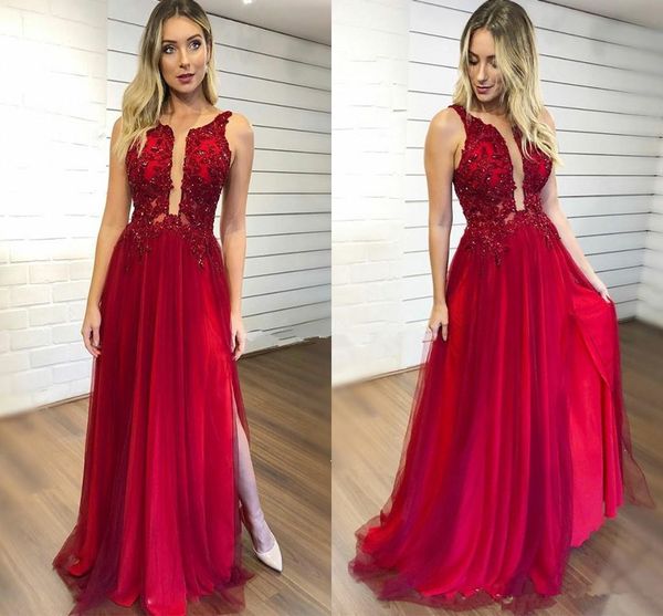 2020 Red Prom Dresses Long Lace Appliques Beaded A Line Evening