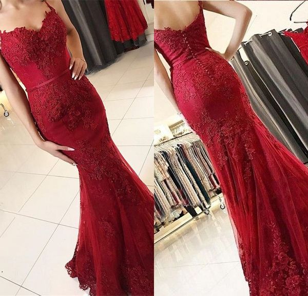 Mermaid Red Lace Spaghetti Straps Scoop Prom Dresses Long Cheap