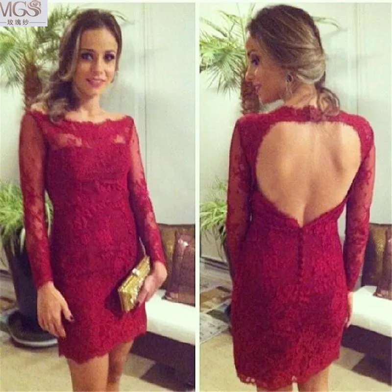 New Sexy 2016 Mgs Burgundy Lace Long Sleeves Open Backless Short