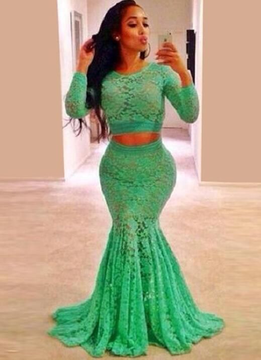 Hot Sale Mint Green Lace Long Sleeve Prom Dresses Plus Size For