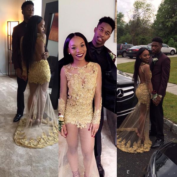 2017 Sexy Gold Mermaid Black Girls Prom Dresses Long Sleeves