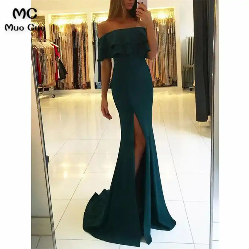 Teal 2018 Mermaid Off Shoulder Prom Dresses Long Elastic Satin