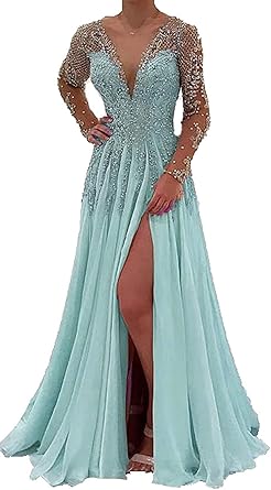 Meaningful Women S V Neck Long Sleeves Prom Dresses Side Slit