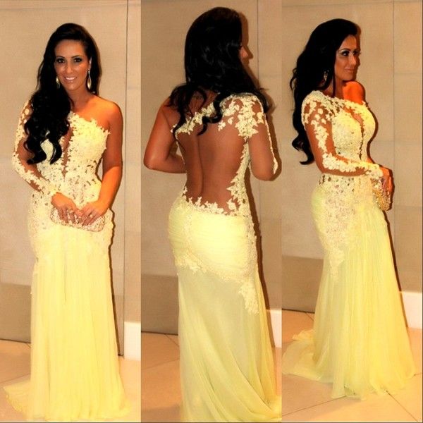 Yellow One Shoulder Prom Dresses Sheer Neck Lace Long Sleeves