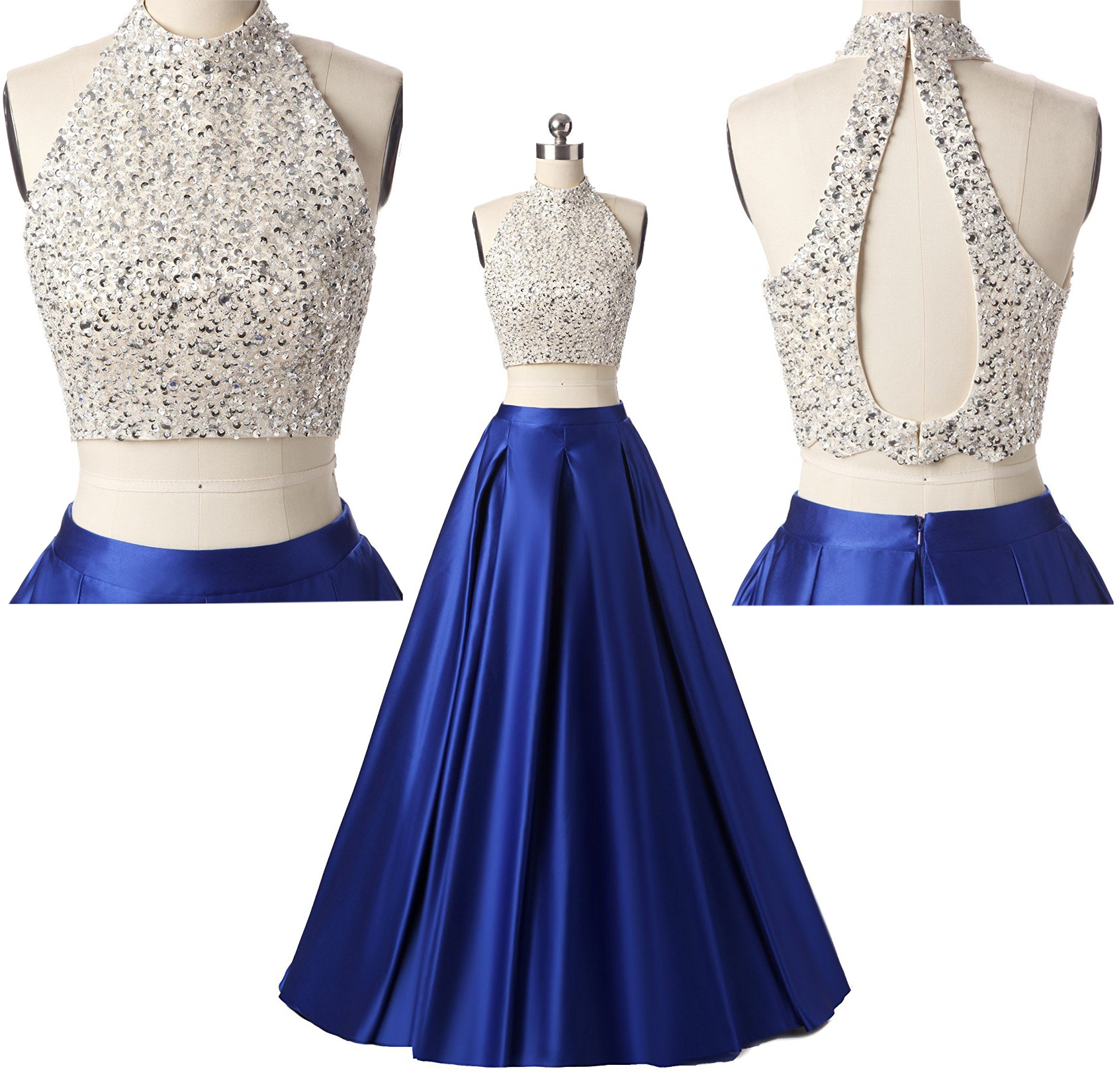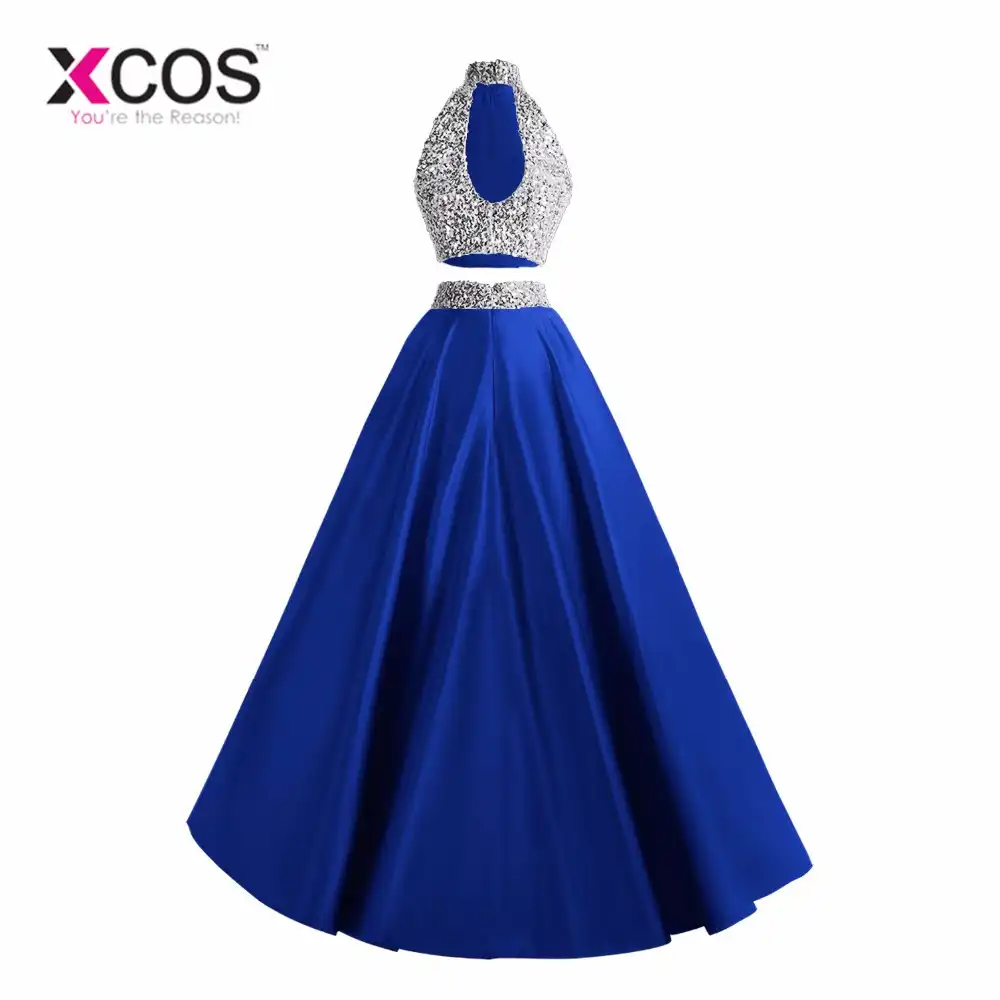 Xcos 2018 New Two Piece Prom Dresses Long Royal Blue Beaded Halter
