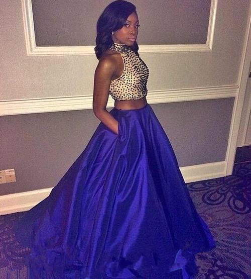 Buy Two Piece Halter Long Royal Blue Prom Dress With Lace Pockets