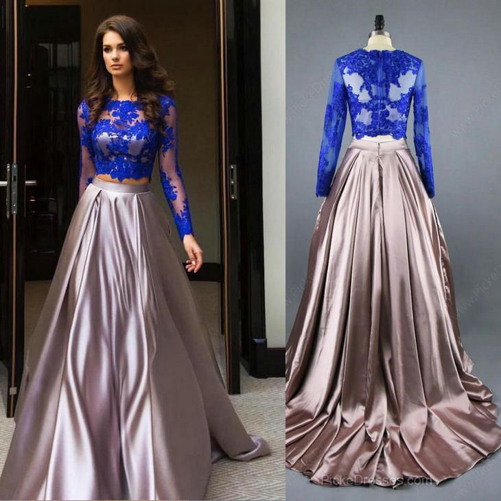Royal Blue Long Sleeve Prom Dresses Two Piece Lace Satin A Line