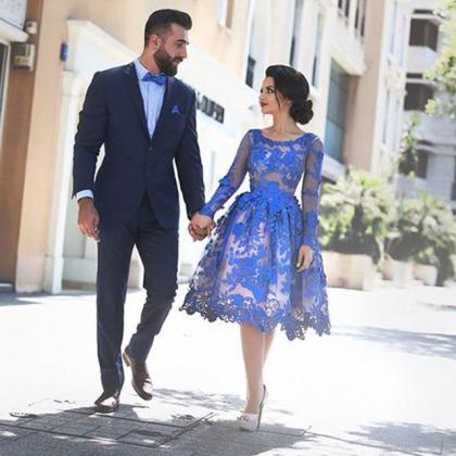 Modest Royal Blue High Neck Sleeved Short Prom Dress Lunss