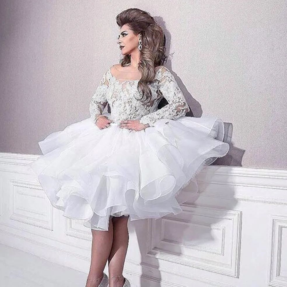 Long Sleeve Lace Party Prom Gown Ruffed Puffy Knee Length Short