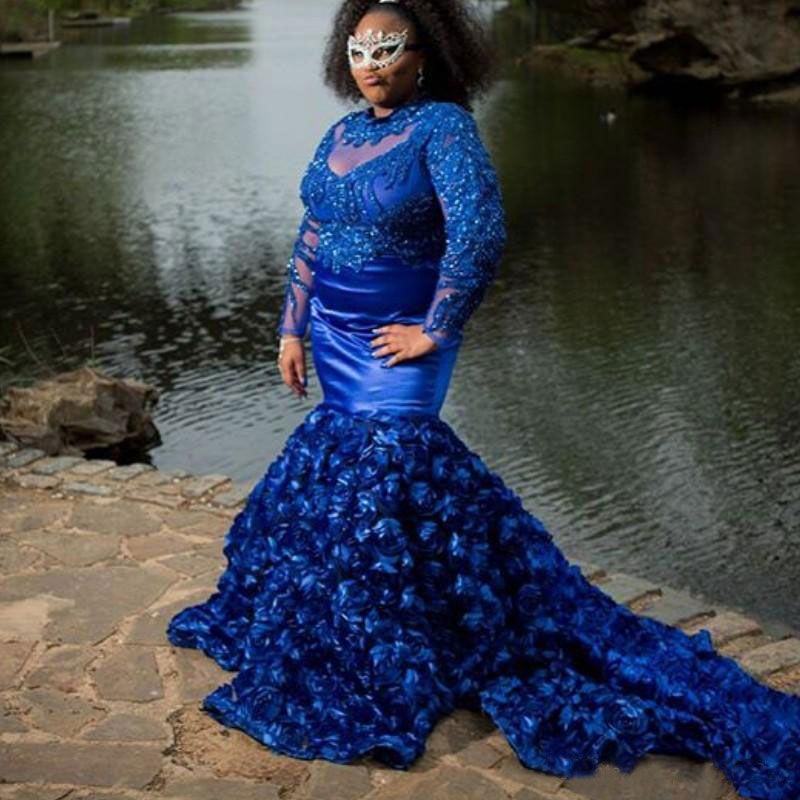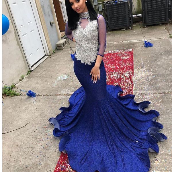 2020 Arabic Royal Blue Mermaid Prom Dresses Long Sleeve Appliques