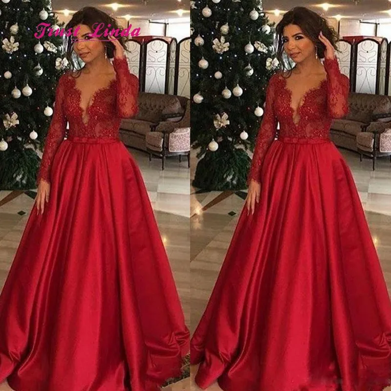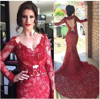 New Design Red Long Prom Dresses Exquisite Lace Long Sleeves