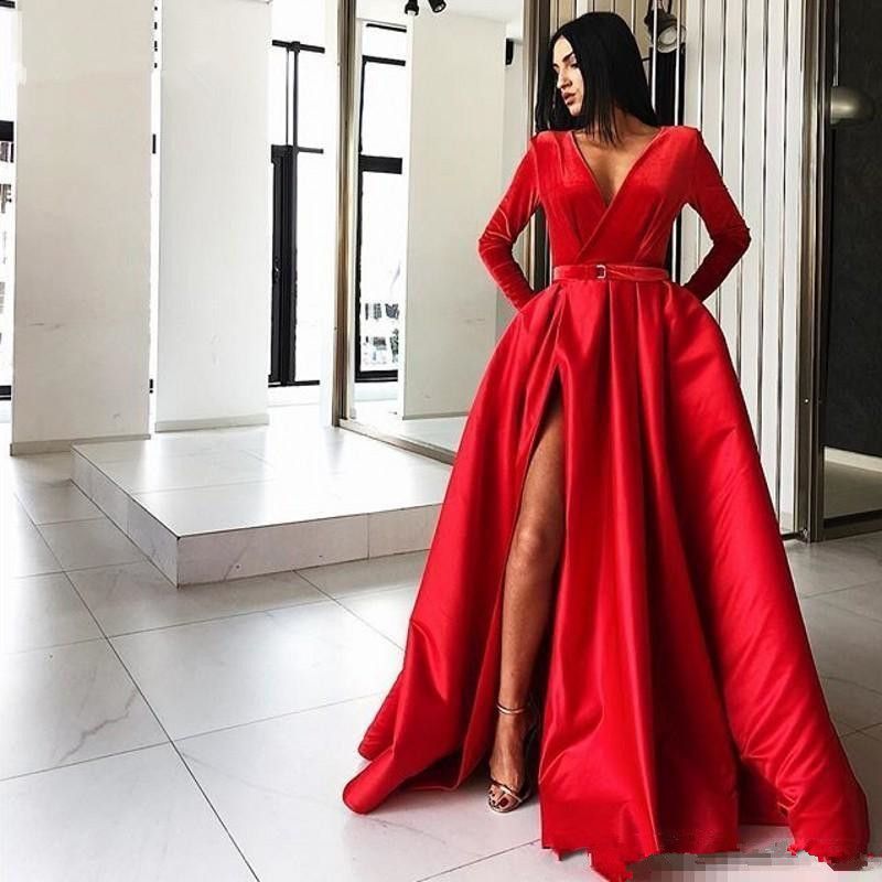 Red Long Sleeves V Neck Prom Dresses Elegant Side Split Evening