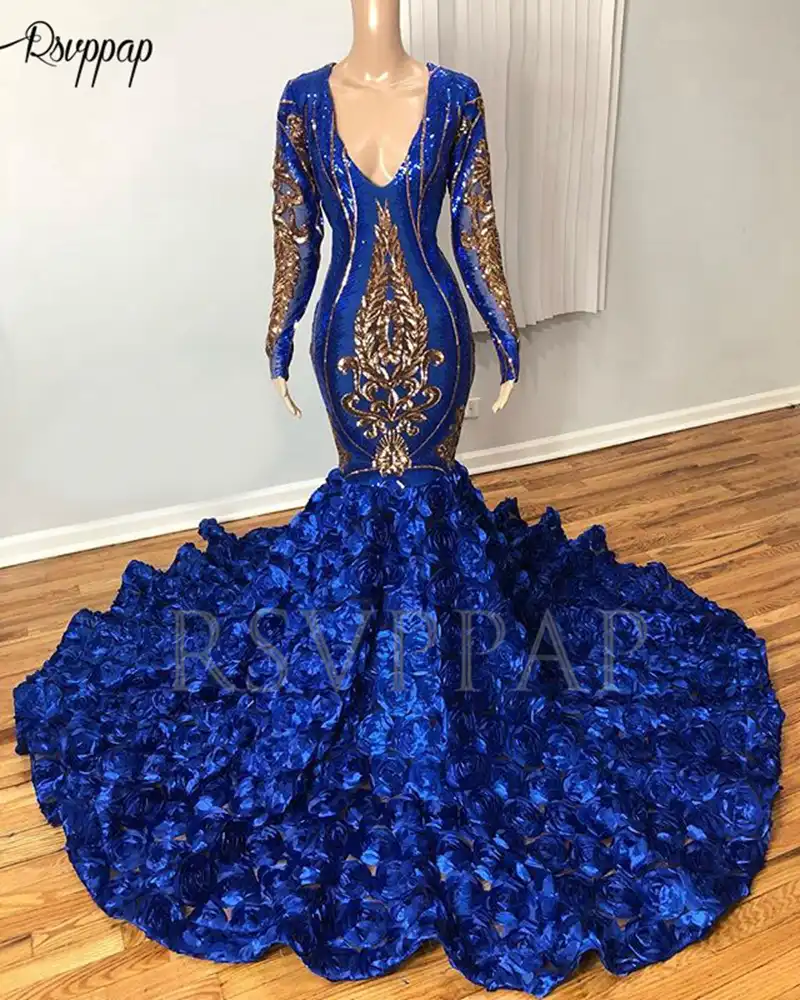 Black Sexy Sequin Top 3d Flowers Long Sleeve Mermaid Prom Dress