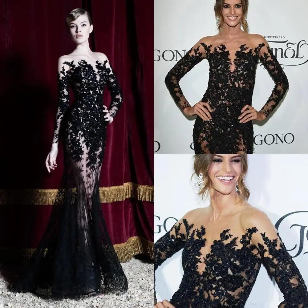 2020 Evening Dresses Long Sleeves Black Lace Sheer Mermaid Prom