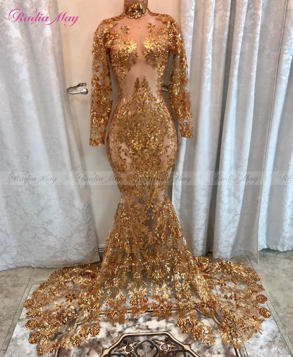 African Gold Mermaid Prom Dresses 2020 Sequined Black Girls