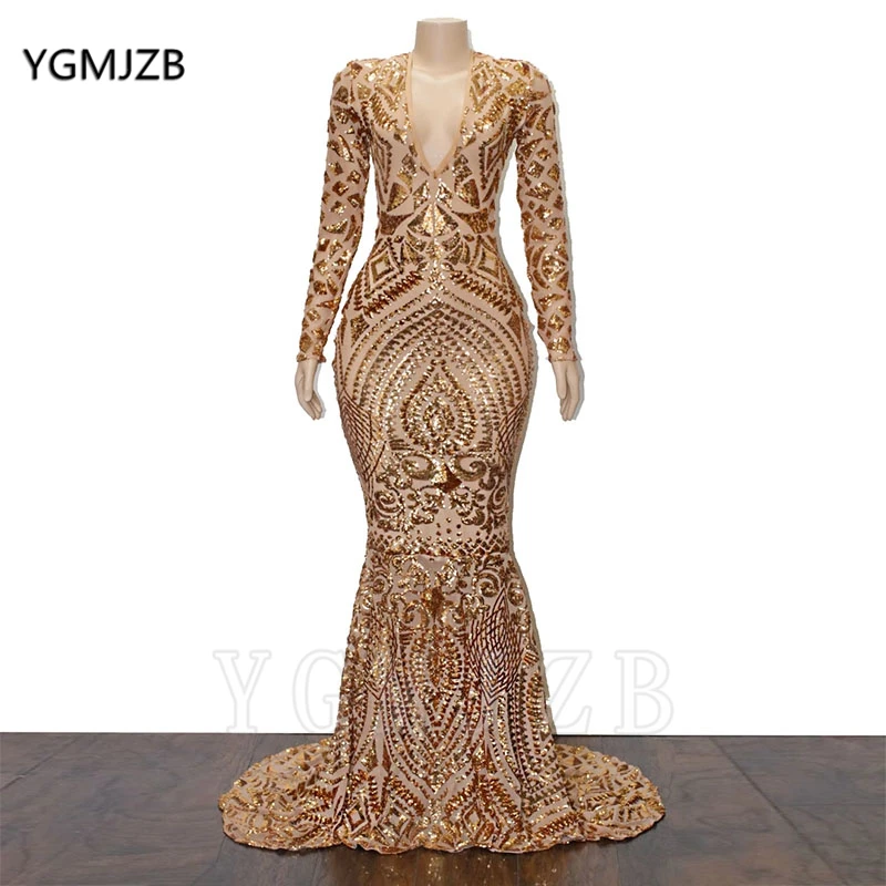 Gold Prom Dresses 2020 Mermaid Long Sleeve V Neck Sparkly Sequin