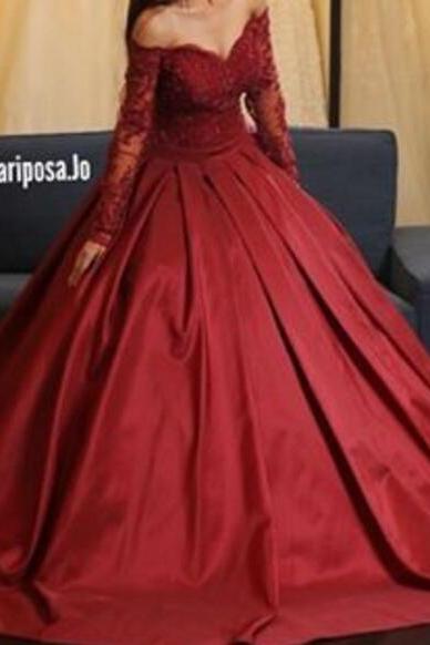 Prom Dress Burgundy Ball Gown Prom Dresses Long Sleeves Lace
