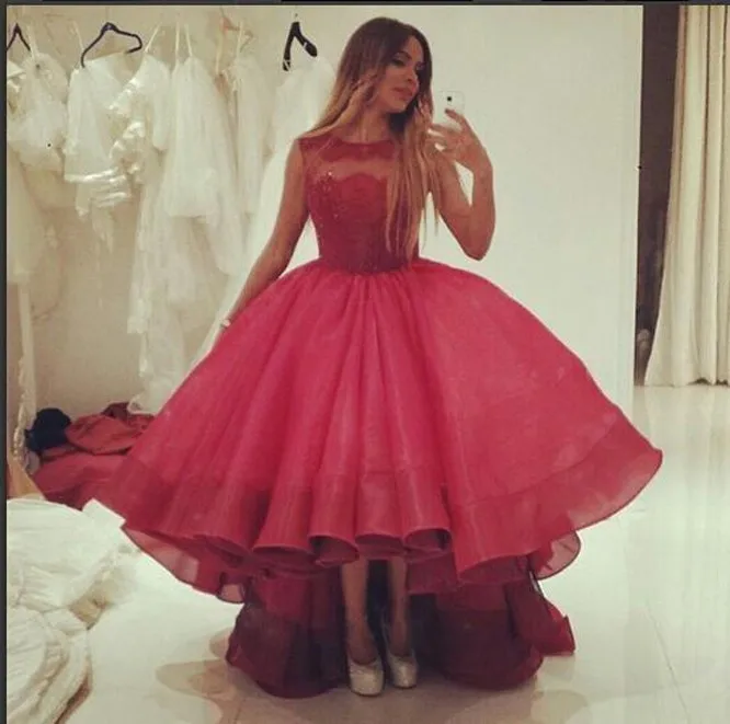 Dark Red Organza High Low Puffy Ball Gown Prom Dresses Jewel Neck