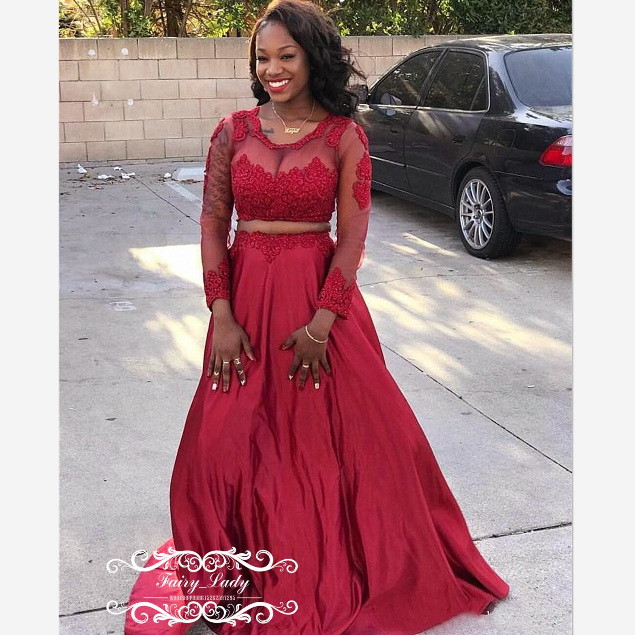 2019 Red Two Piece Crop Top Prom Dresses With Long Sleeves